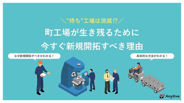 町工場にとって新規開拓が追い風となる3つの理由 町工場にとって新規開拓が追い風となる3つの理由 特徴 01 高齢化・後継者不足で 新規供給会社は求められている サプライヤー 新規開拓の難易度が 下がっている 特徴