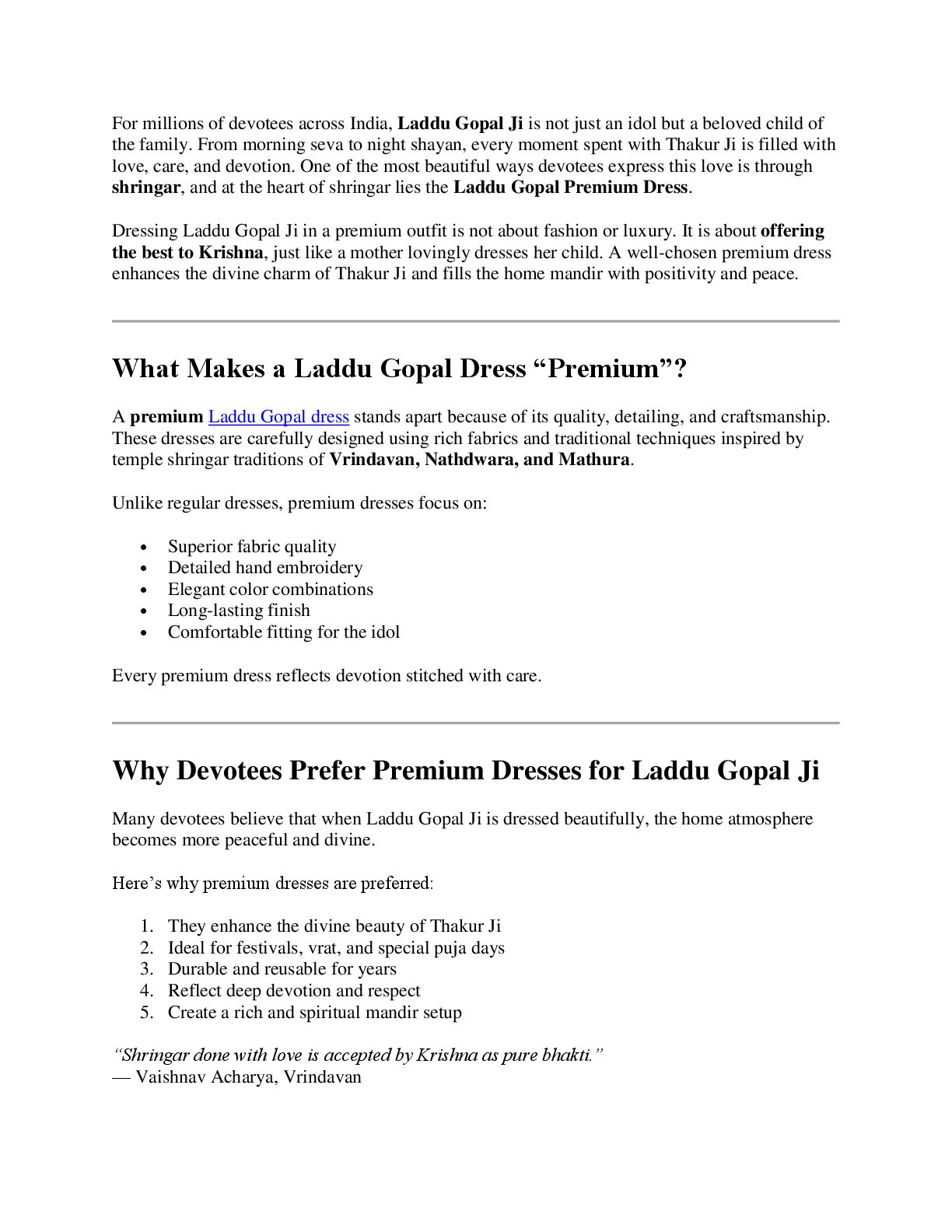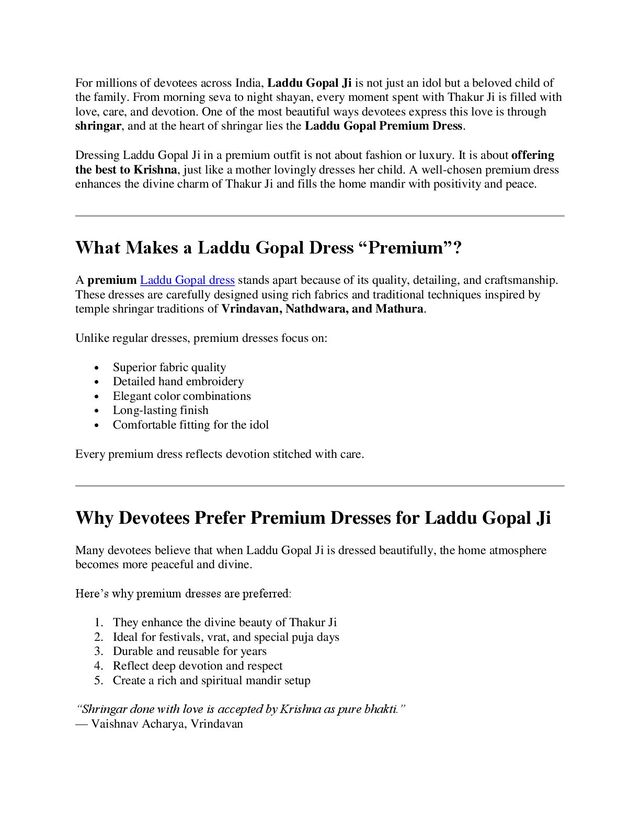 not just an idol but a beloved child of the family. From morning seva to night shayan, every moment spent with Thakur Ji is filled with love, care, and devotion. One of the most beautiful ways devotees express this love is through shringar, and at the heart of shringar lies the Laddu Gopal Premium Dress. Dressing Laddu Gopal Ji in a premium outfit is not about fashion or luxury. It is about offering the best to Krishna, just like a mother lovingly dresses her child. A well-chosen premium dress enhances the divine charm of Thakur Ji and fills the home mandir with positivity and peace. What Makes a Laddu Gopal Dress “Premium”? A premium Laddu Gopal dress stands apart because of its quality, detailing, and craftsmanship. These dresses are carefully designed using rich fabrics and traditional techniques inspired by temple shringar traditions of Vrindavan, Nathdwara, and Mathura. Unlike regular dresses, premium dresses focus on: Superior fabric quality Detailed hand embroidery Elegant color combinations Long-lasting finish Comfortable fitting for the idol Every premium dress reflects devotion stitched with care. Why Devotees Prefer Premium Dresses for Laddu Gopal Ji Many devotees believe that when Laddu Gopal Ji is dressed beautifully, the home atmosphere becomes more peaceful and divine. Here’s why premium dresses are preferred: 1. They enhance the divine beauty of Thakur Ji 2. Ideal for festivals, vrat, and special puja days 3. Durable and reusable for years 4. Reflect deep devotion and respect 5. Create a rich and spiritual mandir setup “Shringar done with love is accepted by Krishna as pure bhakti.” — Vaishnav Acharya, Vrindavan
