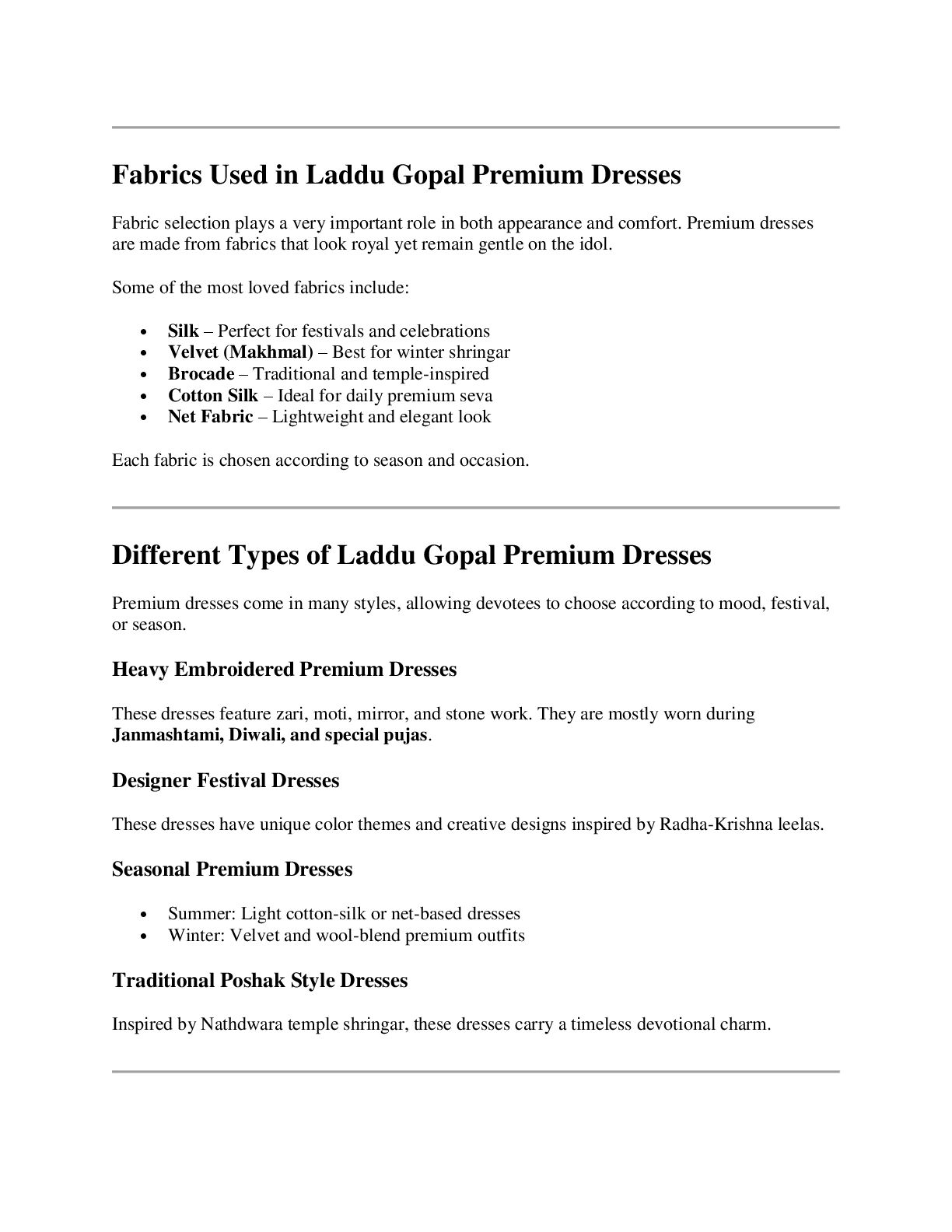 a very important role in both appearance and comfort. Premium dresses are made from fabrics that look royal yet remain gentle on the idol. Some of the most loved fabrics include: Silk – Perfect for festivals and celebrations Velvet (Makhmal) – Best for winter shringar Brocade – Traditional and temple-inspired Cotton Silk – Ideal for daily premium seva Net Fabric – Lightweight and elegant look Each fabric is chosen according to season and occasion. Different Types of Laddu Gopal Premium Dresses Premium dresses come in many styles, allowing devotees to choose according to mood, festival, or season. Heavy Embroidered Premium Dresses These dresses feature zari, moti, mirror, and stone work. They are mostly worn during Janmashtami, Diwali, and special pujas. Designer Festival Dresses These dresses have unique color themes and creative designs inspired by Radha-Krishna leelas. Seasonal Premium Dresses Summer: Light cotton-silk or net-based dresses Winter: Velvet and wool-blend premium outfits Traditional Poshak Style Dresses Inspired by Nathdwara temple shringar, these dresses carry a timeless devotional charm.