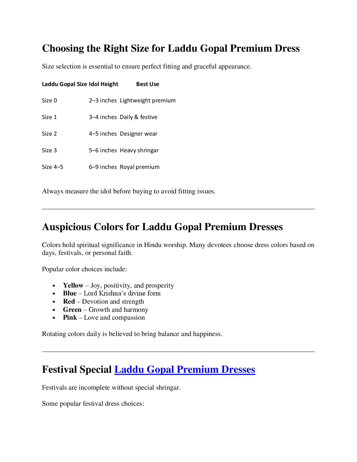 selection is essential to ensure perfect fitting and graceful appearance. Laddu Gopal Size Idol Height Best Use Size 0 2–3 inches Lightweight premium Size 1 3–4 inches Daily & festive Size 2 4–5 inches Designer wear Size 3 5–6 inches Heavy shringar Size 4–5 6–9 inches Royal premium Always measure the idol before buying to avoid fitting issues. Auspicious Colors for Laddu Gopal Premium Dresses Colors hold spiritual significance in Hindu worship. Many devotees choose dress colors based on days, festivals, or personal faith. Popular color choices include: Yellow – Joy, positivity, and prosperity Blue – Lord Krishna’s divine form Red – Devotion and strength Green – Growth and harmony Pink – Love and compassion Rotating colors daily is believed to bring balance and happiness. Festival Special Laddu Gopal Premium Dresses Festivals are incomplete without special shringar. Some popular festival dress choices: