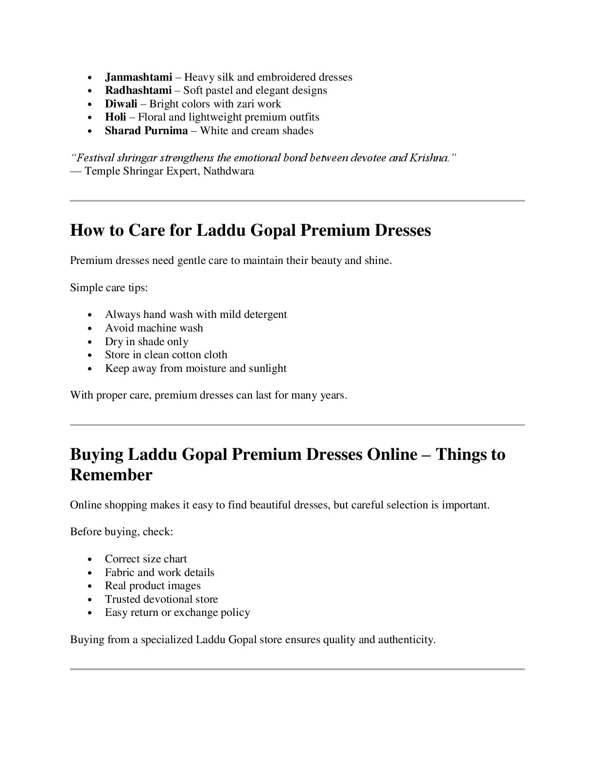 – Soft pastel and elegant designs Diwali – Bright colors with zari work Holi – Floral and lightweight premium outfits Sharad Purnima – White and cream shades “Festival shringar strengthens the emotional bond between devotee and Krishna.” — Temple Shringar Expert, Nathdwara How to Care for Laddu Gopal Premium Dresses Premium dresses need gentle care to maintain their beauty and shine. Simple care tips: Always hand wash with mild detergent Avoid machine wash Dry in shade only Store in clean cotton cloth Keep away from moisture and sunlight With proper care, premium dresses can last for many years. Buying Laddu Gopal Premium Dresses Online – Things to Remember Online shopping makes it easy to find beautiful dresses, but careful selection is important. Before buying, check: Correct size chart Fabric and work details Real product images Trusted devotional store Easy return or exchange policy Buying from a specialized Laddu Gopal store ensures quality and authenticity.