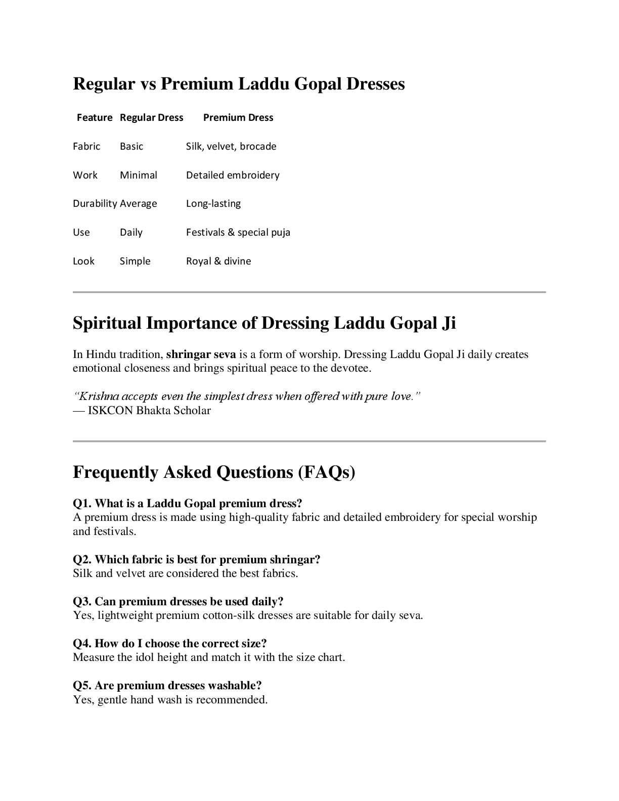 Dress Fabric Basic Silk, velvet, brocade Work Minimal Detailed embroidery Durability Average Long-lasting Use Daily Festivals & special puja Look Simple Royal & divine Spiritual Importance of Dressing Laddu Gopal Ji In Hindu tradition, shringar seva is a form of worship. Dressing Laddu Gopal Ji daily creates emotional closeness and brings spiritual peace to the devotee. “Krishna accepts even the simplest dress when offered with pure love.” — ISKCON Bhakta Scholar Frequently Asked Questions (FAQs) Q1. What is a Laddu Gopal premium dress? A premium dress is made using high-quality fabric and detailed embroidery for special worship and festivals. Q2. Which fabric is best for premium shringar? Silk and velvet are considered the best fabrics. Q3. Can premium dresses be used daily? Yes, lightweight premium cotton-silk dresses are suitable for daily seva. Q4. How do I choose the correct size? Measure the idol height and match it with the size chart. Q5. Are premium dresses washable? Yes, gentle hand wash is recommended.