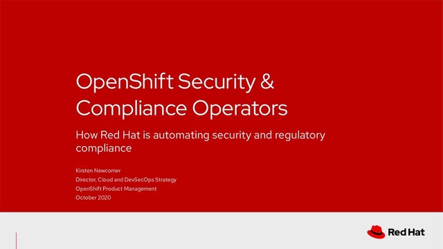 building best practices into SCAP content, with technical implementations for assessment and remediation where possible ▸ Within Red Hat, our goal is to look across relevant security frameworks and codify compliance for the common controls. ▸ Provide as much technical and system level compliance as possible -- minimize manual effort PODS_JSON=$(oc get pods -n openshift-kube-apiserver -l app=openshift-kube-apiserver -ojson) REVISION=$(echo $PODS_JSON | jq -r .items[0].metadata.labels.revision) for i in $(echo $PODS_JSON | jq -r .items[].metadata.name); do oc exec -n openshift-kube-apiserver -c kube-apiserver-$REVISION $i -- stat -c %a /etc/kubernetes/static-pod-resources/kube-a piserver-pod.yaml ; done