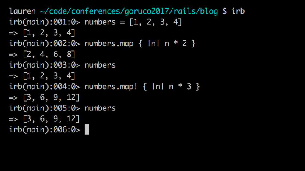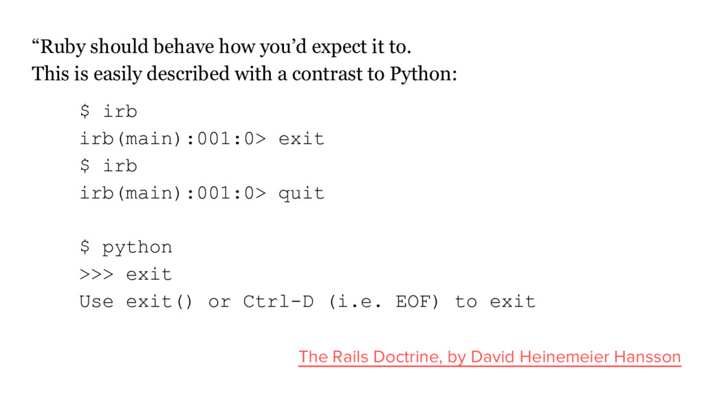 easily described with a contrast to Python: $ irb irb(main):001:0> exit $ irb irb(main):001:0> quit $ python >>> exit Use exit() or Ctrl-D (i.e. EOF) to exit The Rails Doctrine, by David Heinemeier Hansson