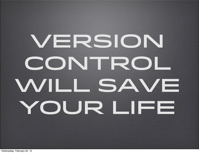 for the invite • The guys who work for me for putting up with my rants about version control • Dav Glass @davglass from Yahoo! for the swag Wednesday, February 20, 13