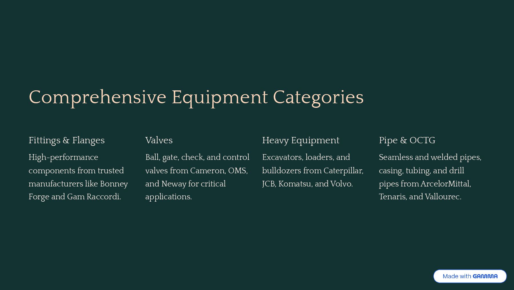manufacturers like Bonney Forge and Gam Raccordi. Valves Ball, gate, check, and control valves from Cameron, OMS, and Neway for critical applications. Heavy Equipment Excavators, loaders, and bulldozers from Caterpillar, JCB, Komatsu, and Volvo. Pipe & OCTG Seamless and welded pipes, casing, tubing, and drill pipes from ArcelorMittal, Tenaris, and Vallourec.