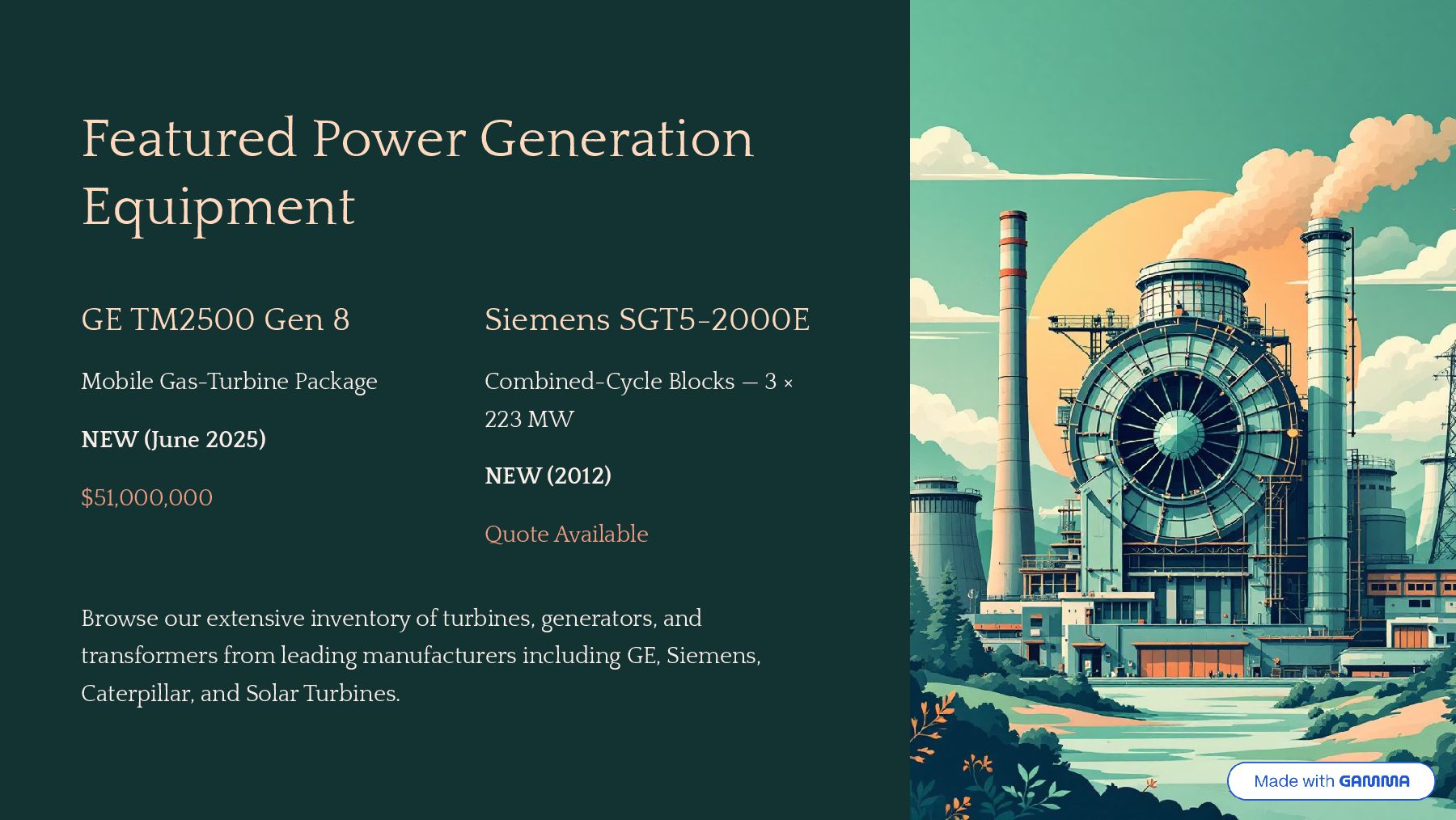 Package NEW (June 2025) $51,000,000 Siemens SGT5-2000E Combined-Cycle Blocks 4 3 × 223 MW NEW (2012) Quote Available Browse our extensive inventory of turbines, generators, and transformers from leading manufacturers including GE, Siemens, Caterpillar, and Solar Turbines.