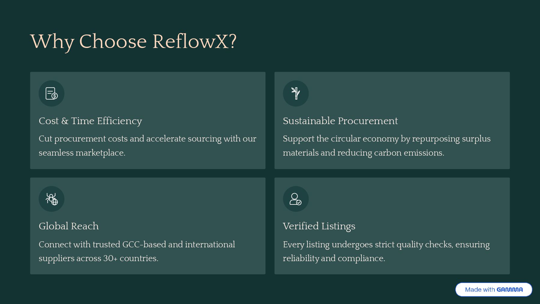 and accelerate sourcing with our seamless marketplace. Sustainable Procurement Support the circular economy by repurposing surplus materials and reducing carbon emissions. Global Reach Connect with trusted GCC-based and international suppliers across 30+ countries. Verified Listings Every listing undergoes strict quality checks, ensuring reliability and compliance.