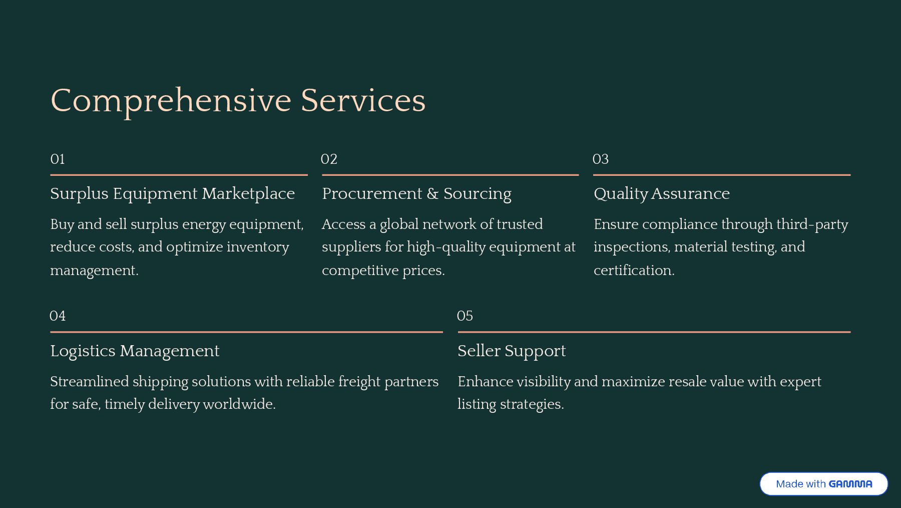 energy equipment, reduce costs, and optimize inventory management. 02 Procurement & Sourcing Access a global network of trusted suppliers for high-quality equipment at competitive prices. 03 Quality Assurance Ensure compliance through third-party inspections, material testing, and certification. 04 Logistics Management Streamlined shipping solutions with reliable freight partners for safe, timely delivery worldwide. 05 Seller Support Enhance visibility and maximize resale value with expert listing strategies.