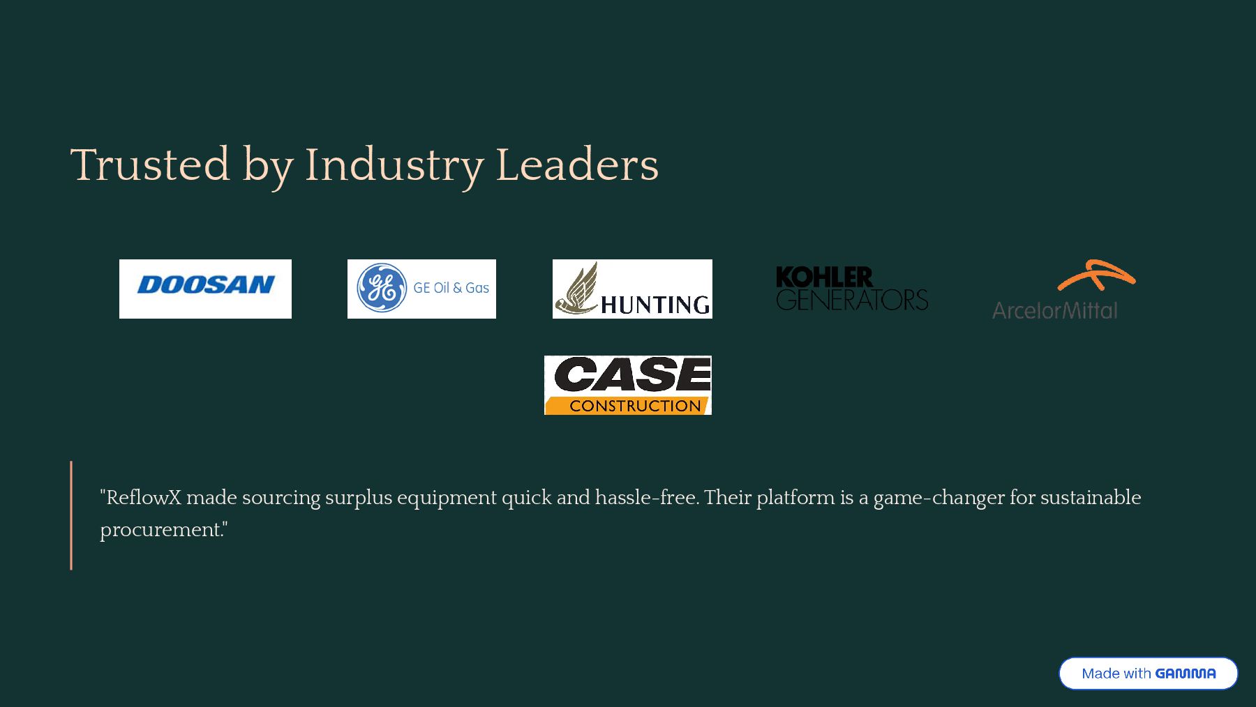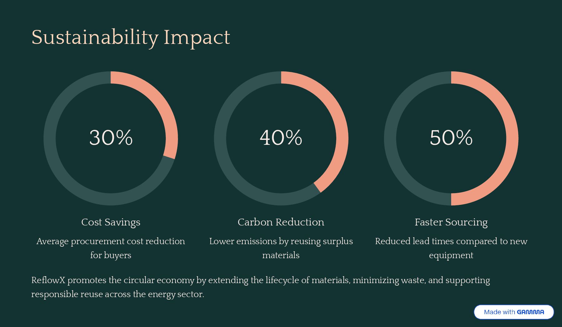 buyers 40% Carbon Reduction Lower emissions by reusing surplus materials 50% Faster Sourcing Reduced lead times compared to new equipment ReflowX promotes the circular economy by extending the lifecycle of materials, minimizing waste, and supporting responsible reuse across the energy sector.