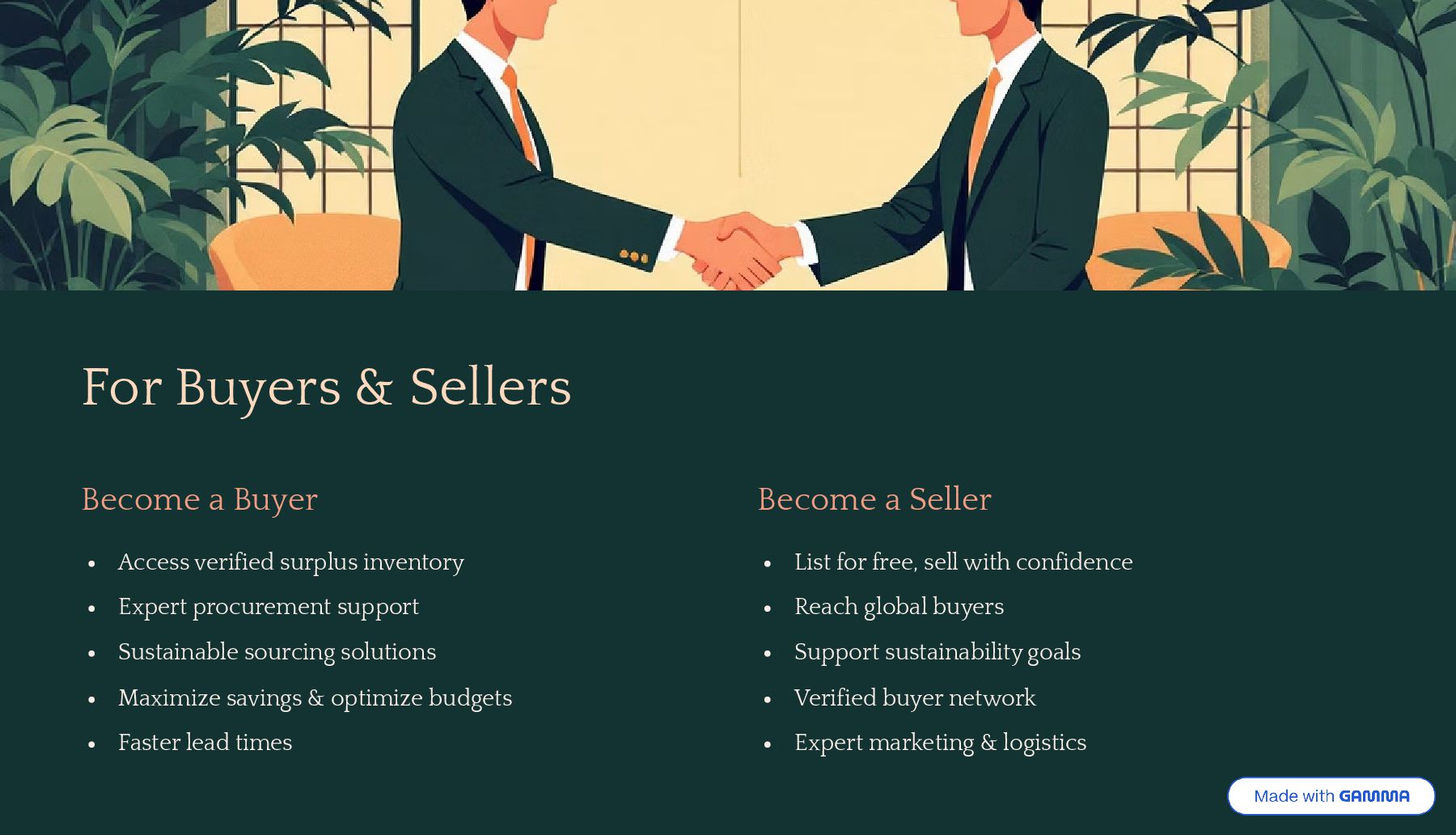 inventory Expert procurement support Sustainable sourcing solutions Maximize savings & optimize budgets Faster lead times Become a Seller List for free, sell with confidence Reach global buyers Support sustainability goals Verified buyer network Expert marketing & logistics