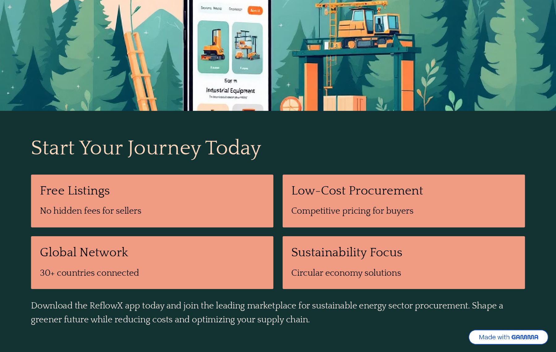 sellers Low-Cost Procurement Competitive pricing for buyers Global Network 30+ countries connected Sustainability Focus Circular economy solutions Download the ReflowX app today and join the leading marketplace for sustainable energy sector procurement. Shape a greener future while reducing costs and optimizing your supply chain.