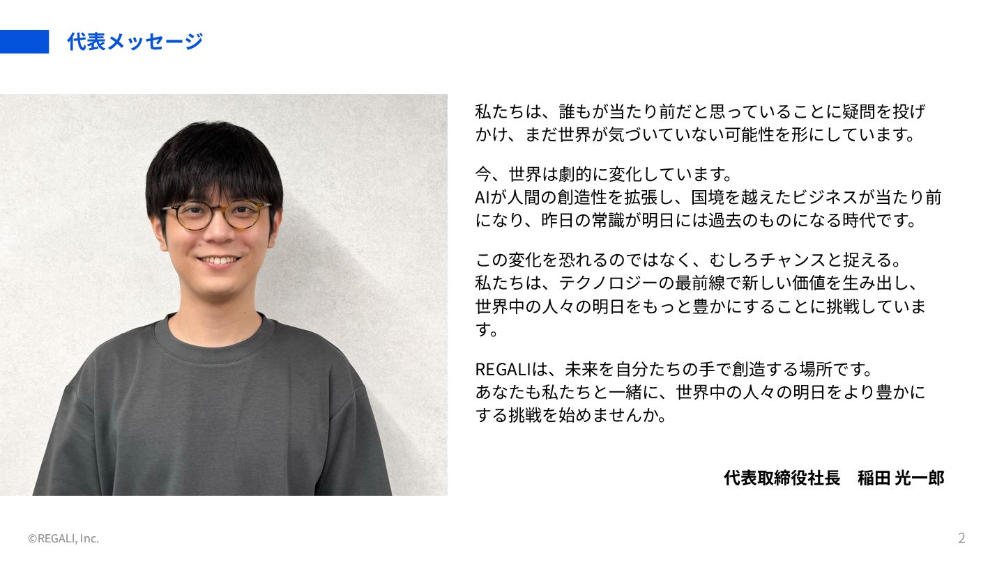 世界中の⼈々の明⽇をもっと豊かにすることに挑戦していま す。 REGALIは、未来を⾃分たちの⼿で創造する場所です。 あなたも私たちと⼀緒に、世界中の⼈々の明⽇をより豊かに する挑戦を始めませんか。 代表取締役社⻑ 稲⽥ 光⼀郎 ©REGALI, Inc. 代表メッセージ