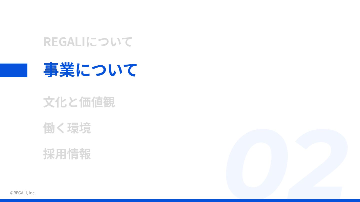 ©REGALI, Inc. 02 REGALIについて 事業について ⽂化と価値観 働く環境 採⽤情報 ©REGALI, Inc.