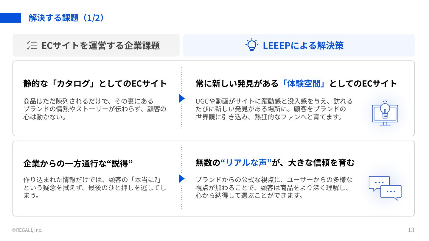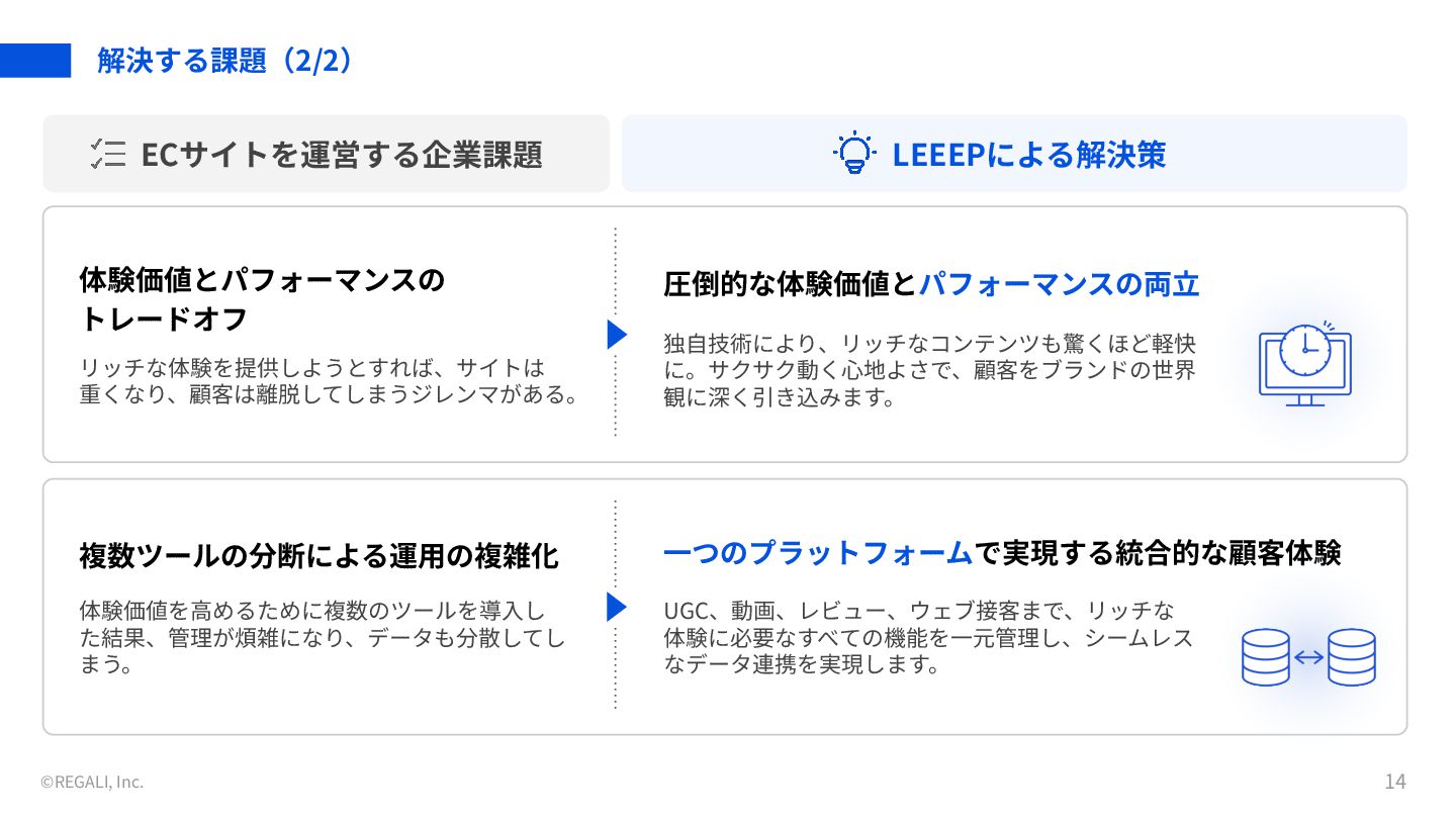 ©REGALI, Inc. LEEEPによる解決策 ECサイトを運営する企業課題 解決する課題(1/2) 静的な「カタログ」としてのECサイト 商品はただ陳列されるだけで、その裏にある ブランドの情熱やストーリーが伝わらず、顧客の ⼼は動かない。 13