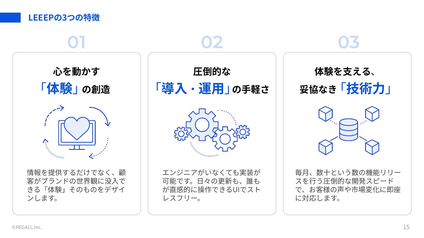 ©REGALI, Inc. LEEEPの3つの特徴 情報を提供するだけでなく、顧 客がブランドの世界観に没⼊で きる「体験」そのものをデザイ ンします。 エンジニアがいなくても実装が 可能です。⽇々の更新も、誰も が直感的に操作できるUIでスト