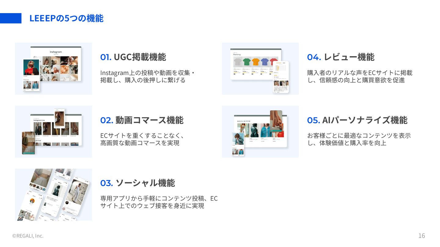 ©REGALI, Inc. LEEEPの5つの機能 16 Instagram上の投稿や動画を収集‧ 掲載し、購⼊の後押しに繋げる 01. UGC掲載機能 ECサイトを重くすることなく、 ⾼画質な動画コマースを実現