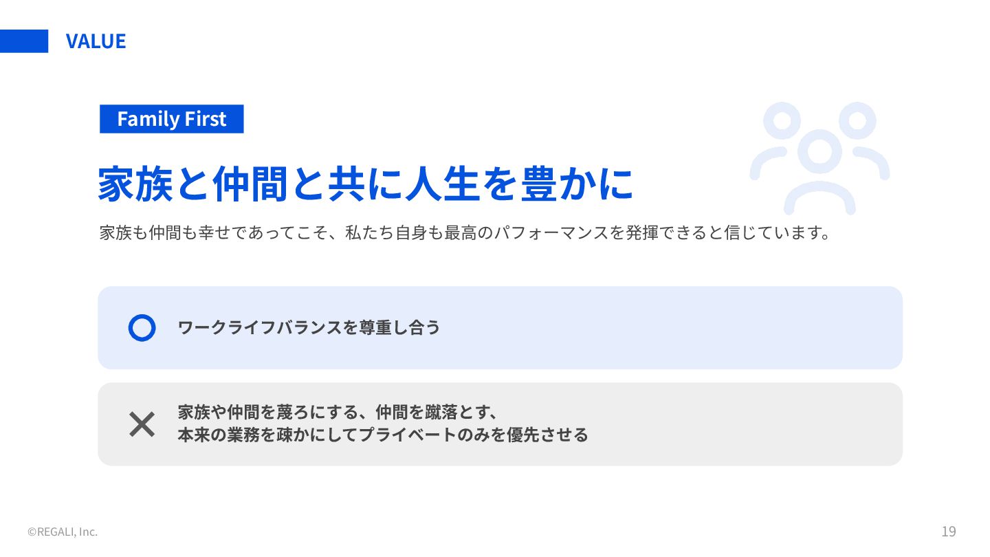 ©REGALI, Inc. VALUE 家族も仲間も幸せであってこそ、私たち⾃⾝も最⾼のパフォーマンスを発揮できると信じています。 ワークライフバランスを尊重し合う 家族と仲間と共に⼈⽣を豊かに Family First 家族や仲間を蔑ろにする、仲間を蹴落とす、 本来の業務を疎かにしてプライベートのみを優先させる