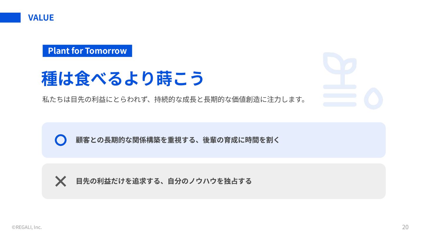 ©REGALI, Inc. VALUE 私たちは⽬先の利益にとらわれず、持続的な成⻑と⻑期的な価値創造に注⼒します。 顧客との⻑期的な関係構築を重視する、後輩の育成に時間を割く 種は⾷べるより蒔こう Plant for Tomorrow ⽬先の利益だけを追求する、⾃分のノウハウを独占する
