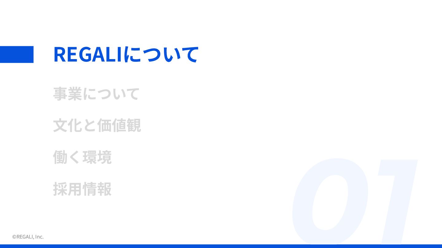 ©REGALI, Inc. 01 REGALIについて 事業について ⽂化と価値観 働く環境 採⽤情報 ©REGALI, Inc.