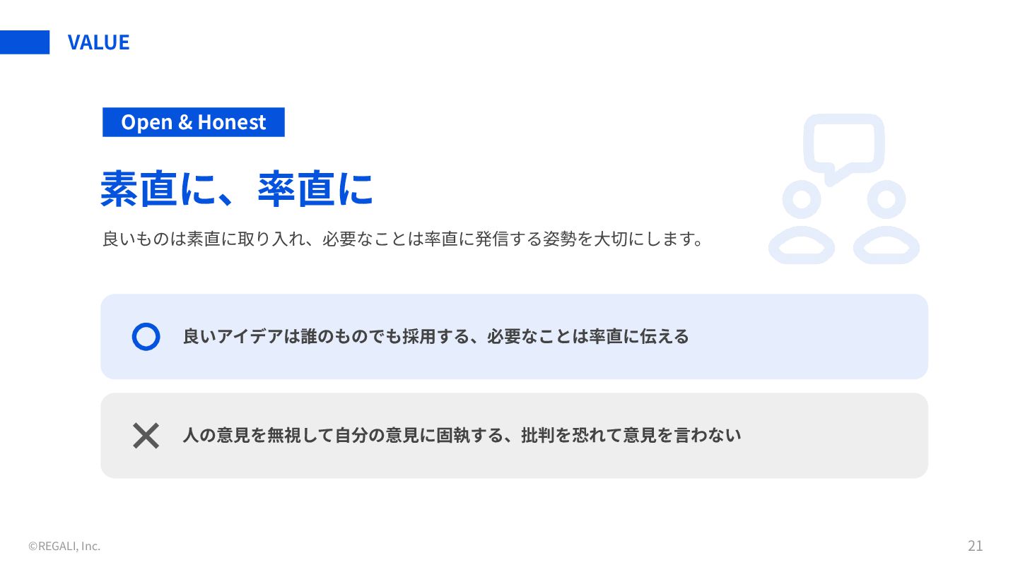 ©REGALI, Inc. VALUE 良いものは素直に取り⼊れ、必要なことは率直に発信する姿勢を⼤切にします。 良いアイデアは誰のものでも採⽤する、必要なことは率直に伝える 素直に、率直に Open & Honest 21