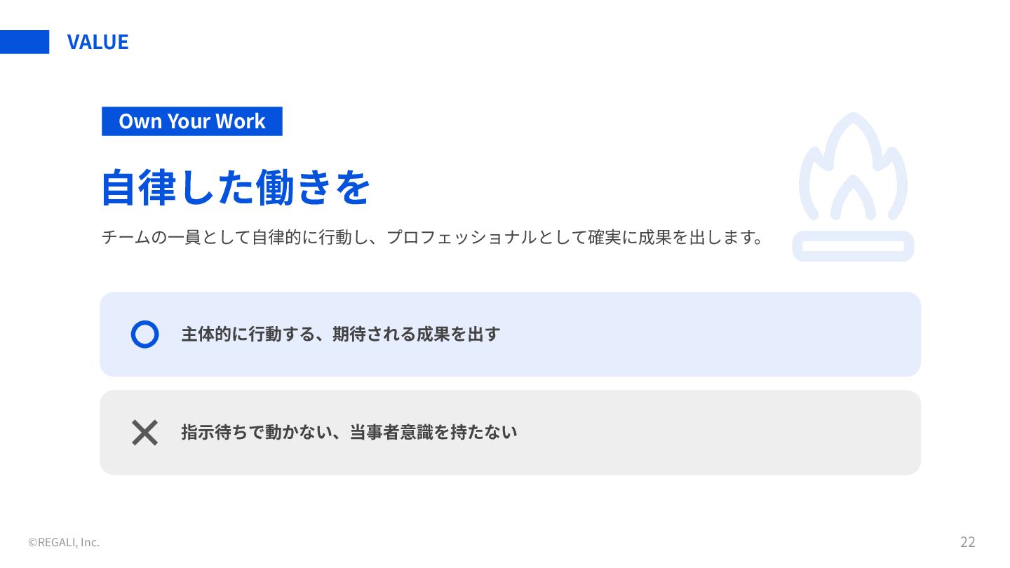 ©REGALI, Inc. VALUE チームの⼀員として⾃律的に⾏動し、プロフェッショナルとして確実に成果を出します。 主体的に⾏動する、期待される成果を出す ⾃律した働きを Own Your Work 22