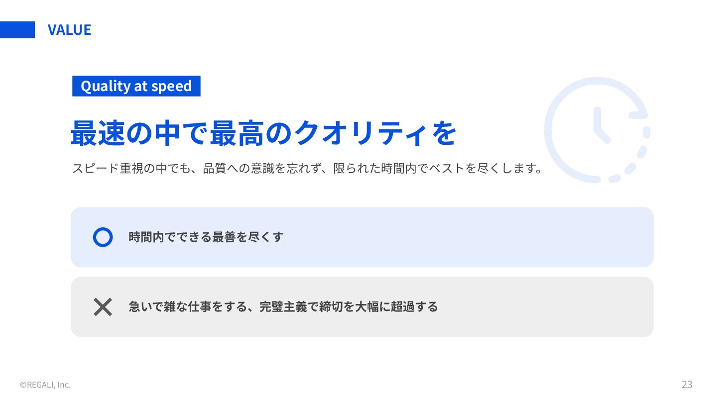 ©REGALI, Inc. VALUE スピード重視の中でも、品質への意識を忘れず、限られた時間内でベストを尽くします。 時間内でできる最善を尽くす 最速の中で最⾼のクオリティを Quality at speed 23