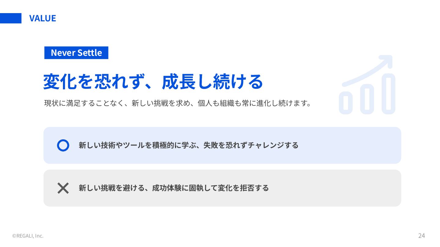 ©REGALI, Inc. VALUE 現状に満⾜することなく、新しい挑戦を求め、個⼈も組織も常に進化し続けます。 新しい技術やツールを積極的に学ぶ、失敗を恐れずチャレンジする 変化を恐れず、成⻑し続ける Never Settle 24 新しい挑戦を避ける、成功体験に固執して変化を拒否する