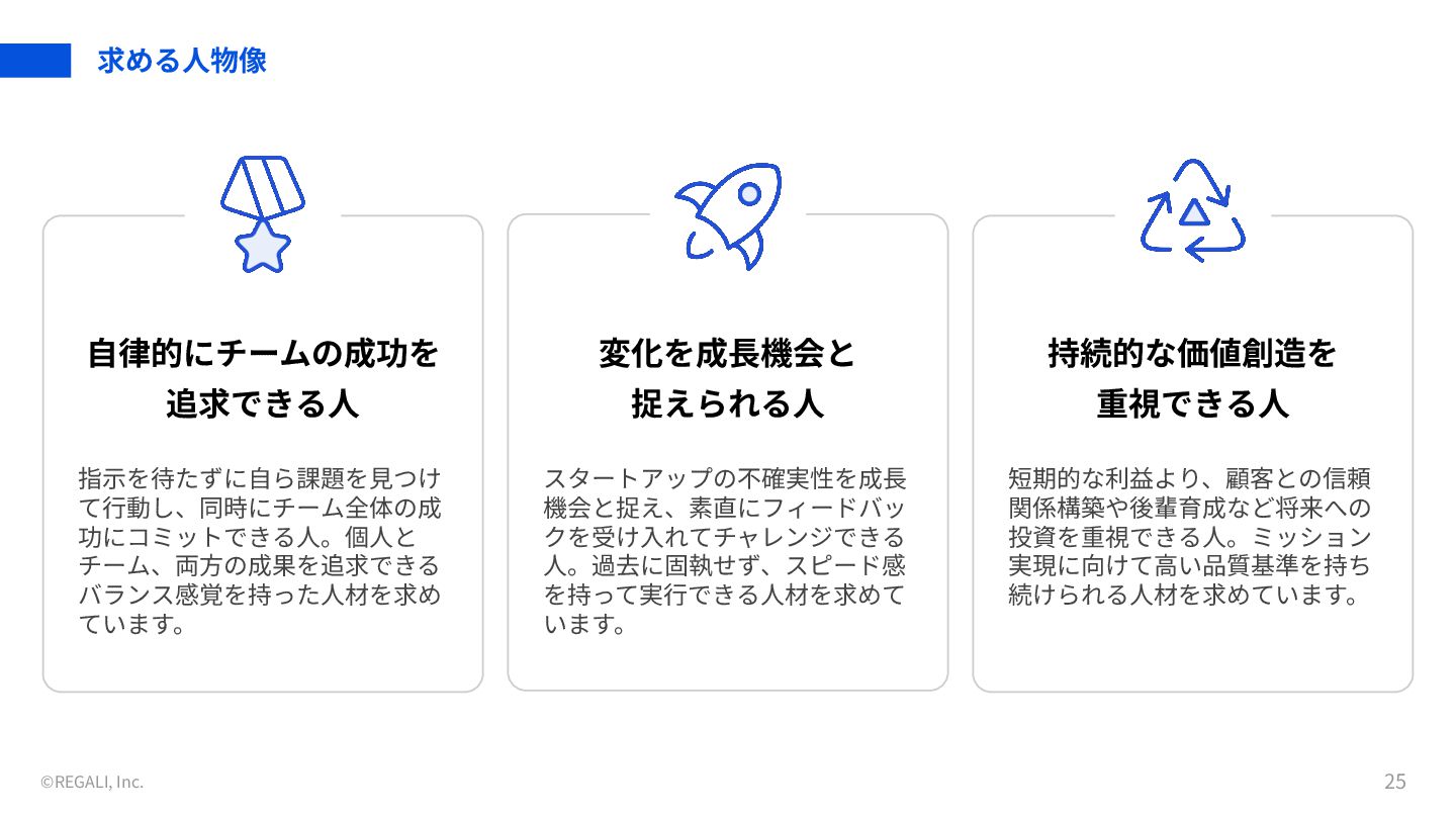 ©REGALI, Inc. 求める⼈物像 ⾃律的にチームの成功を 追求できる⼈ 指⽰を待たずに⾃ら課題を⾒つけ て⾏動し、同時にチーム全体の成 功にコミットできる⼈。個⼈と チーム、両⽅の成果を追求できる バランス感覚を持った⼈材を求め