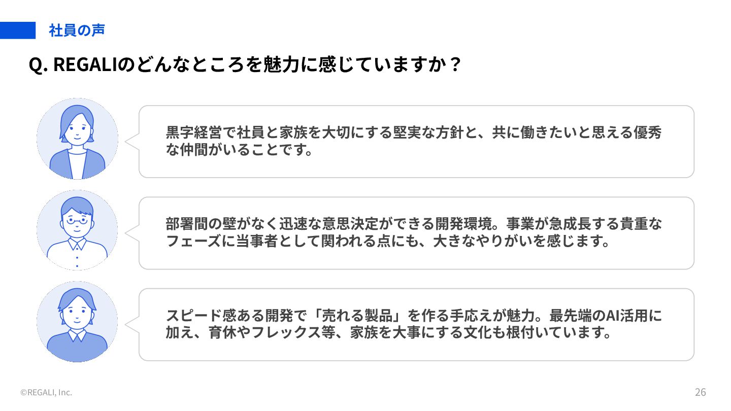 ©REGALI, Inc. 社員の声 黒字経営で社員と家族を⼤切にする堅実な⽅針と、共に働きたいと思える優秀 な仲間がいることです。 26 部署間の壁がなく迅速な意思決定ができる開発環境。事業が急成⻑する貴重な フェーズに当事者として関われる点にも、⼤きなやりがいを感じます。 スピード感ある開発で「売れる製品」を作る⼿応えが魅⼒。最先端のAI活⽤に 加え、育休やフレックス等、家族を⼤事にする⽂化も根付いています。