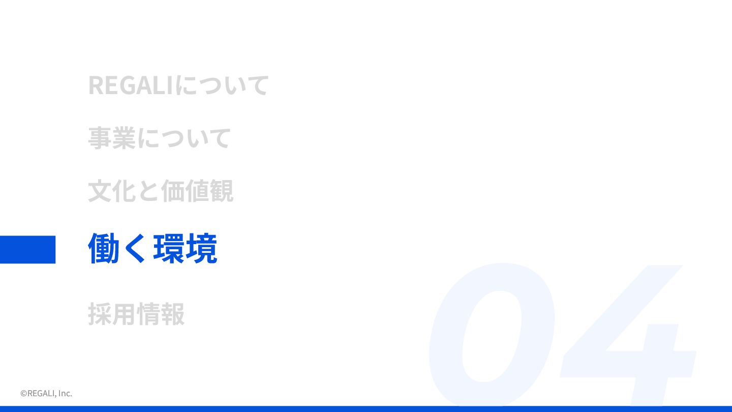 ©REGALI, Inc. 04 REGALIについて 事業について ⽂化と価値観 働く環境 採⽤情報 ©REGALI, Inc.