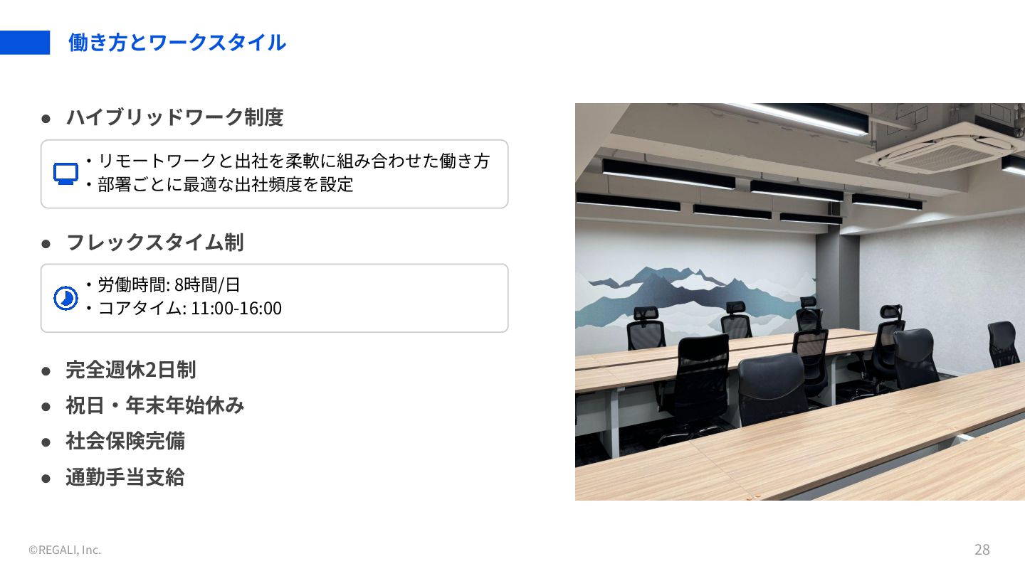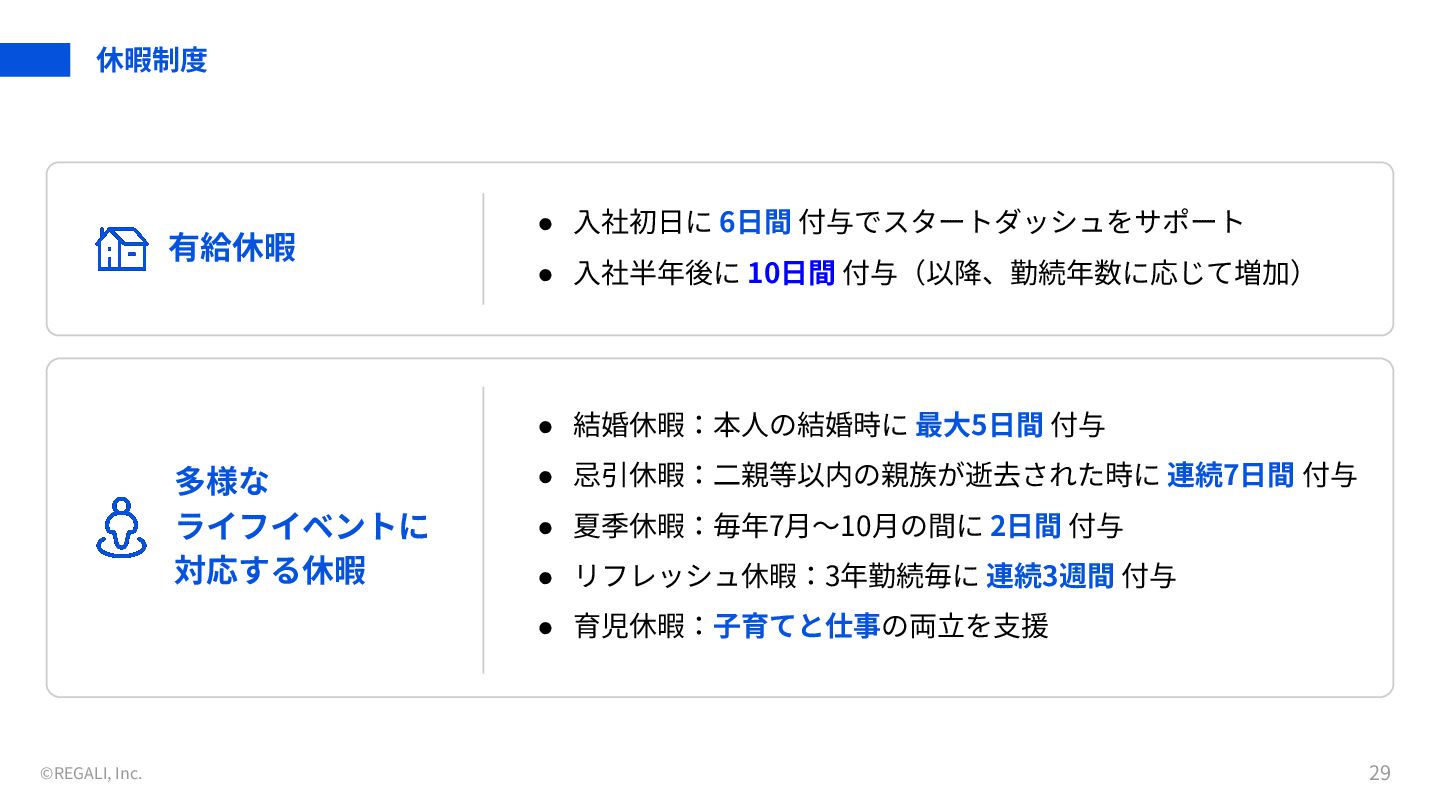 ©REGALI, Inc. 働き⽅とワークスタイル 28 • 完全週休2⽇制 • 祝⽇‧年末年始休み • 社会保険完備