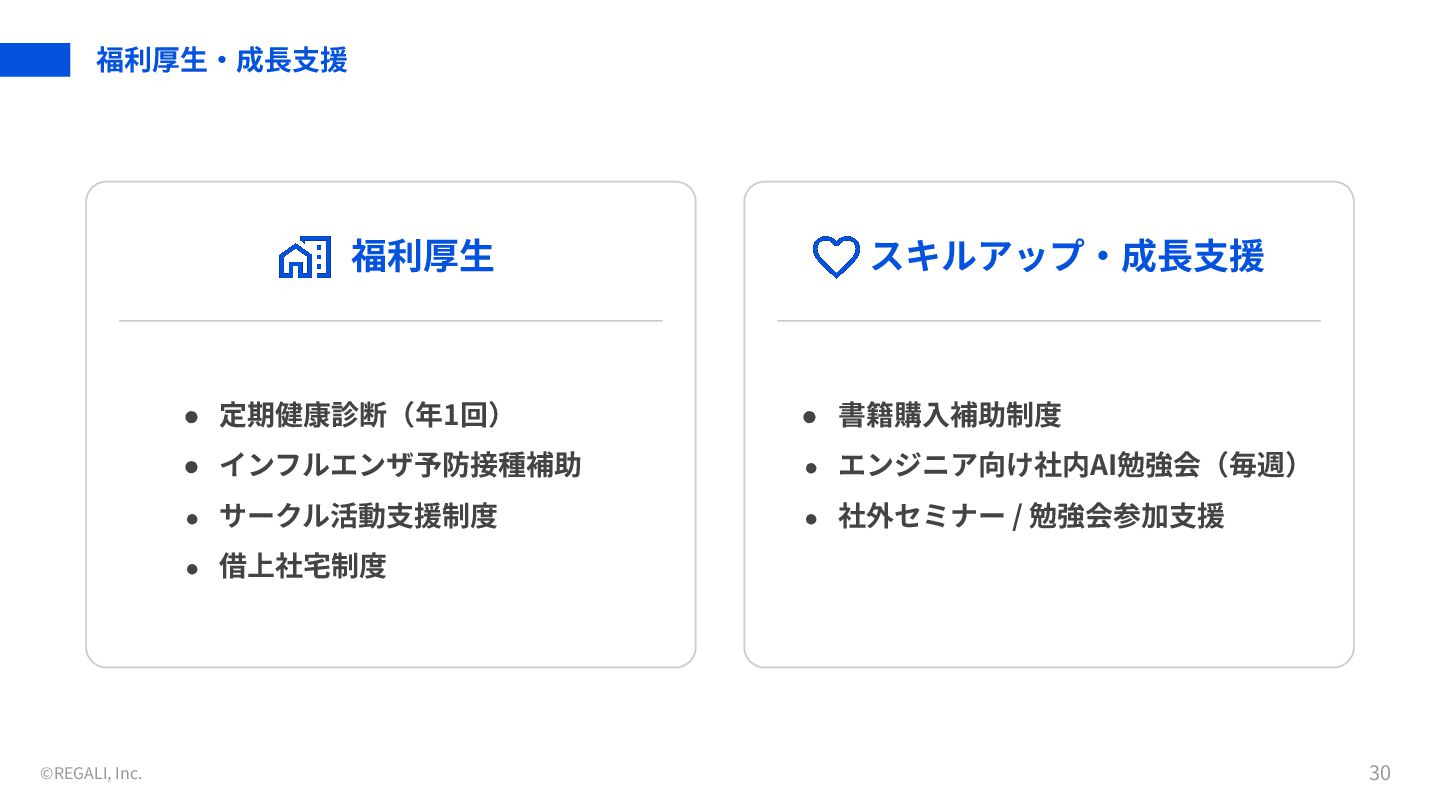 ©REGALI, Inc. 福利厚⽣‧成⻑⽀援 30 • 書籍購⼊補助制度 • エンジニア向け社内AI勉強会(毎週) • 社外セミナー