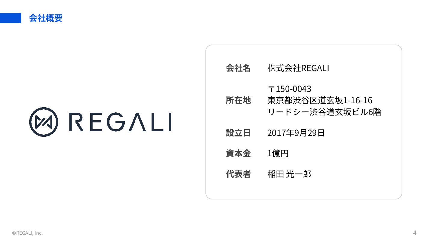 ©REGALI, Inc. 2 私たちは、誰もが当たり前だと思っていることに疑問を投げ かけ、まだ世界が気づいていない可能性を形にしています。 今、世界は劇的に変化しています。 AIが⼈間の創造性を拡張し、国境を越えたビジネスが当たり前 になり、昨⽇の常識が明⽇には過去のものになる時代です。 この変化を恐れるのではなく、むしろチャンスと捉える。 私たちは、テクノロジーの最前線で新しい価値を⽣み出し、
