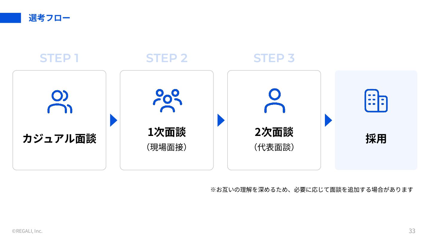 ©REGALI, Inc. 選考フロー 33 カジュアル⾯談 1次⾯談 (現場⾯接) 2次⾯談 (代表⾯談) 採⽤