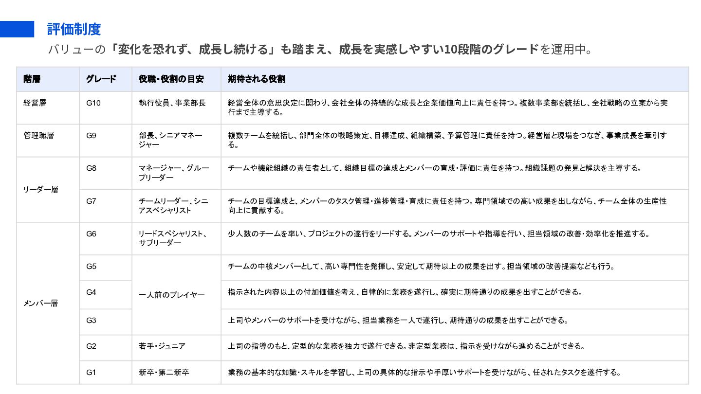 G10 執行役員、事業部長 経営全体の意思決定に関わり、会社全体の持続的な成長と企業価値向上に責任を持つ。複数事業部を統括し、全社戦略の立案から実 行まで主導する。 管理職層 G9 部長、シニアマネー ジャー 複数チームを統括し、部門全体の戦略策定、目標達成、組織構築、予算管理に責任を持つ。経営層と現場をつなぎ、事業成長を牽引す る。 リーダー層 G8 マネージャー、グルー プリーダー チームや機能組織の責任者として、組織目標の達成とメンバーの育成・評価に責任を持つ。組織課題の発見と解決を主導する。 G7 チームリーダー、シニ アスペシャリスト チームの目標達成と、メンバーのタスク管理・進捗管理・育成に責任を持つ。専門領域での高い成果を出しながら、チーム全体の生産性 向上に貢献する。 メンバー層 G6 リードスペシャリスト、 サブリーダー 少人数のチームを率い、プロジェクトの遂行をリードする。メンバーのサポートや指導を行い、担当領域の改善・効率化を推進する。 G5 一人前のプレイヤー チームの中核メンバーとして、高い専門性を発揮し、安定して期待以上の成果を出す。担当領域の改善提案なども行う。 G4 指示された内容以上の付加価値を考え、自律的に業務を遂行し、確実に期待通りの成果を出すことができる。 G3 上司やメンバーのサポートを受けながら、担当業務を一人で遂行し、期待通りの成果を出すことができる。 G2 若手・ジュニア 上司の指導のもと、定型的な業務を独力で遂行できる。非定型業務は、指示を受けながら進めることができる。 G1 新卒・第二新卒 業務の基本的な知識・スキルを学習し、上司の具体的な指示や手厚いサポートを受けながら、任されたタスクを遂行する。