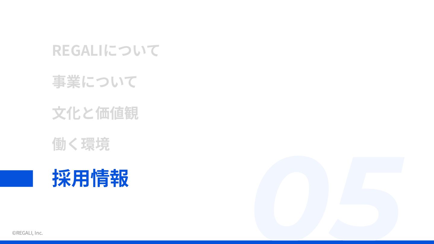 ©REGALI, Inc. 05 REGALIについて 事業について ⽂化と価値観 働く環境 採⽤情報 ©REGALI, Inc.