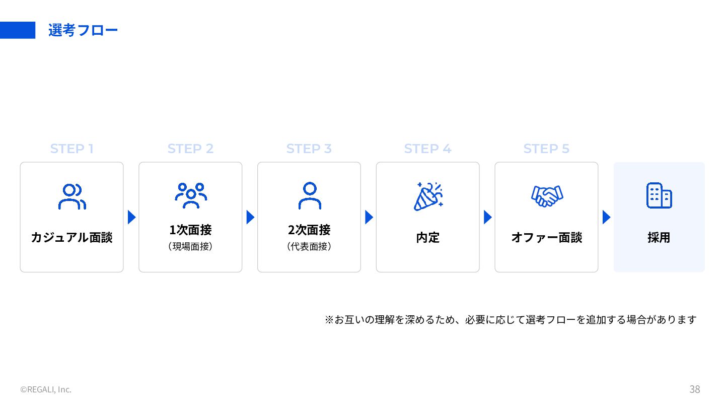 ©REGALI, Inc. 選考フロー 38 カジュアル⾯談 1次⾯接 (現場⾯接) 2次⾯接 (代表⾯接) 採⽤