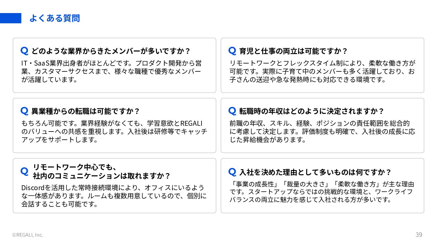 ©REGALI, Inc. よくある質問 39 どのような業界からきたメンバーが多いですか? IT‧SaaS業界出⾝者がほとんどです。プロダクト開発から営 業、カスタマーサクセスまで、様々な職種で優秀なメンバー が活躍しています。 Q 異業種からの転職は可能ですか?