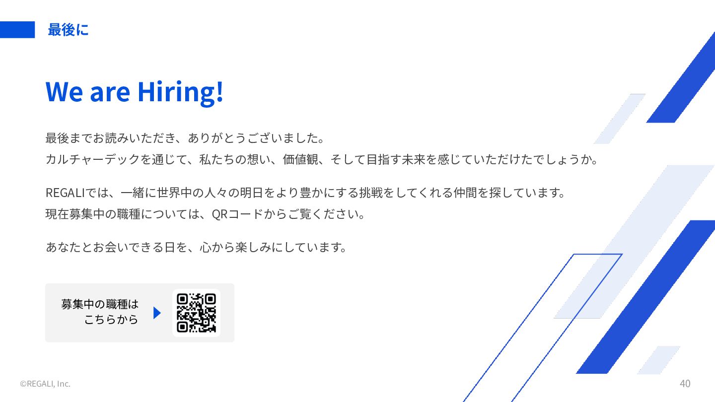 ©REGALI, Inc. We are Hiring! 最後までお読みいただき、ありがとうございました。 カルチャーデックを通じて、私たちの想い、価値観、そして⽬指す未来を感じていただけたでしょうか。 REGALIでは、⼀緒に世界中の⼈々の明⽇をより豊かにする挑戦をしてくれる仲間を探しています。 現在募集中の職種については、QRコードからご覧ください。 あなたとお会いできる⽇を、⼼から楽しみにしています。