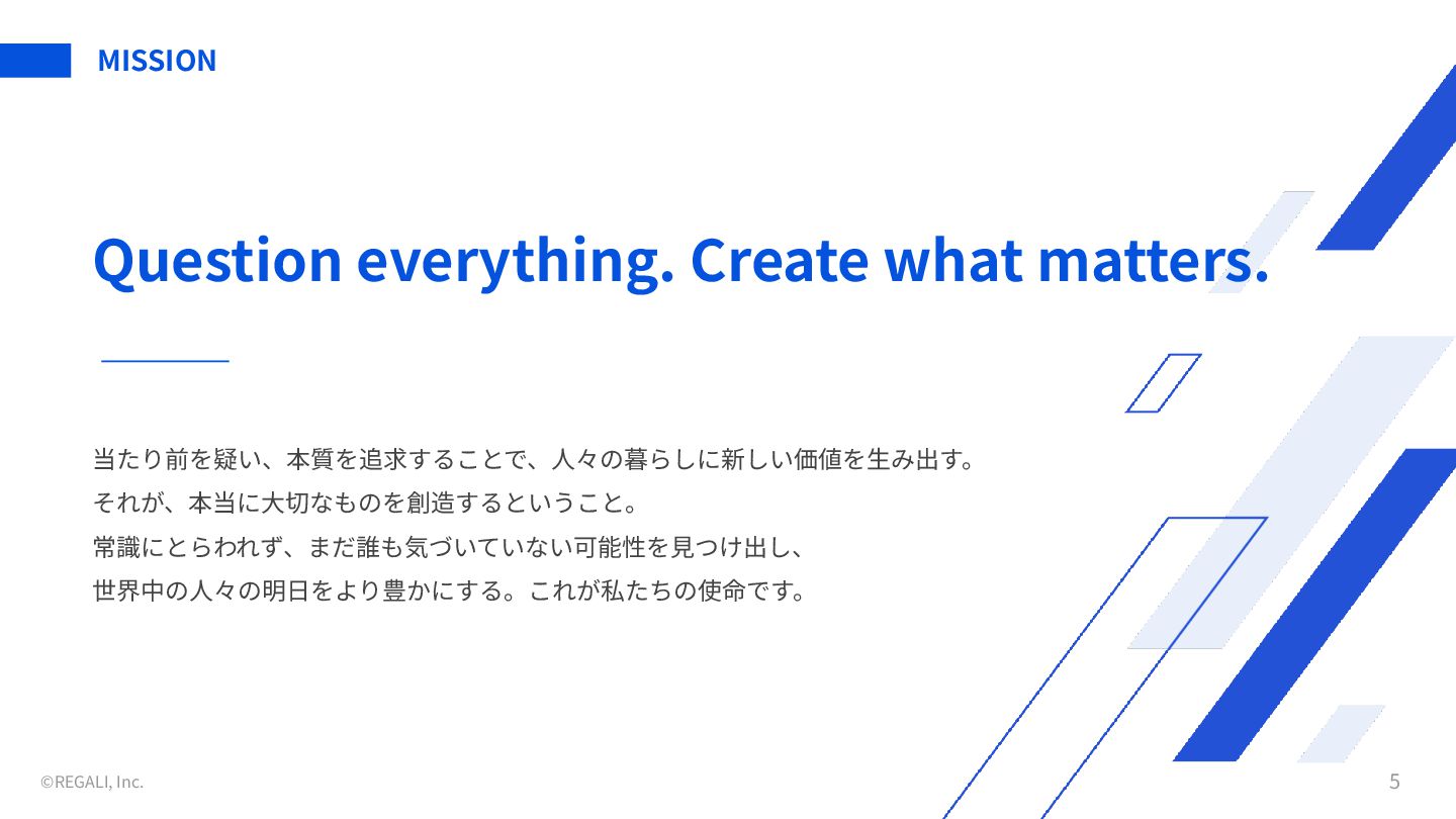 ©REGALI, Inc. Question everything. Create what matters. 当たり前を疑い、本質を追求することで、⼈々の暮らしに新しい価値を⽣み出す。 それが、本当に⼤切なものを創造するということ。 常識にとらわれず、まだ誰も気づいていない可能性を⾒つけ出し、