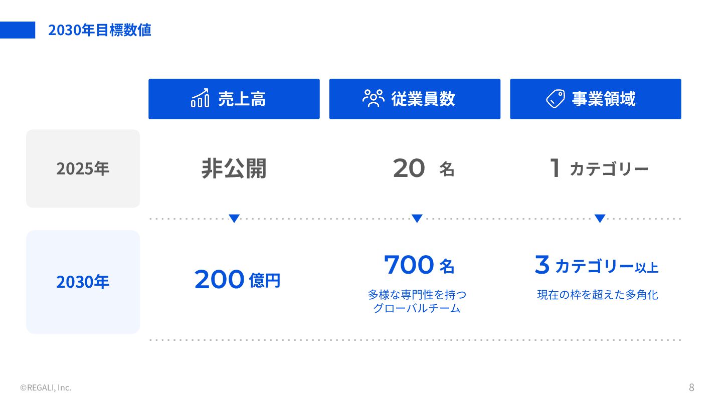 ©REGALI, Inc. 2030年⽬標数値 8 億円 200 ⾮公開 名 700 カテゴリー以上