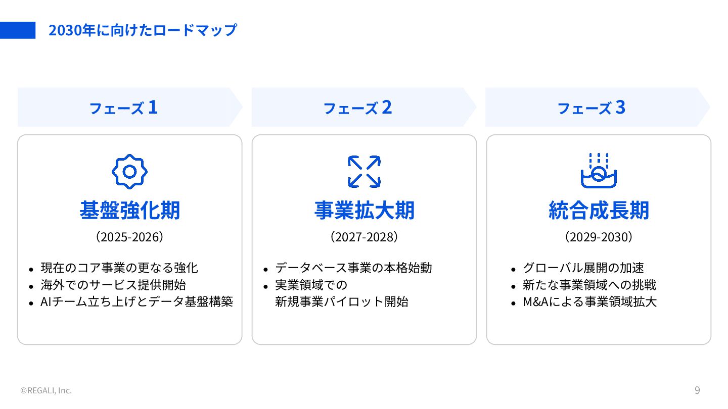 • AIチーム⽴ち上げとデータ基盤構築 フェーズ 1 フェーズ 2 フェーズ 3 事業拡⼤期 (2027-2028) 統合成⻑期 (2029-2030) • データベース事業の本格始動 • 実業領域での 新規事業パイロット開始 • グローバル展開の加速 • 新たな事業領域への挑戦 • M&Aによる事業領域拡⼤