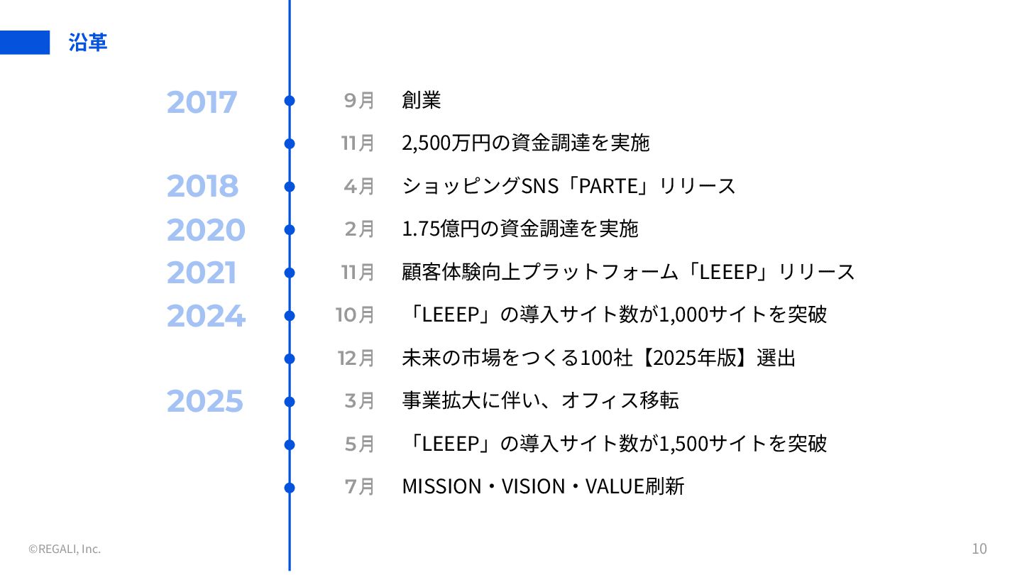©REGALI, Inc. 沿⾰ 10 創業 2,500万円の資⾦調達を実施 ショッピングSNS「PARTE」リリース 1.75億円の資⾦調達を実施 顧客体験向上プラットフォーム「LEEEP」リリース 「LEEEP」の導⼊サイト数が1,000サイトを突破