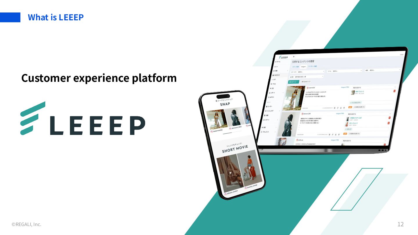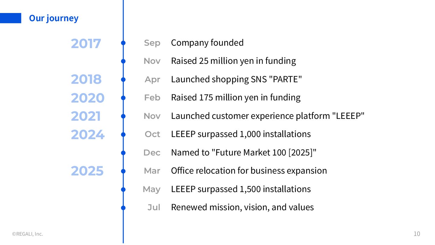 yen in funding Launched shopping SNS "PARTE" Raised 175 million yen in funding Launched customer experience platform "LEEEP" LEEEP surpassed 1,000 installations Named to "Future Market 100 [2025]" Office relocation for business expansion LEEEP surpassed 1,500 installations Renewed mission, vision, and values 2017 Sep Nov Apr Feb Nov Oct Dec Mar May Jul 2018 2020 2021 2024 2025