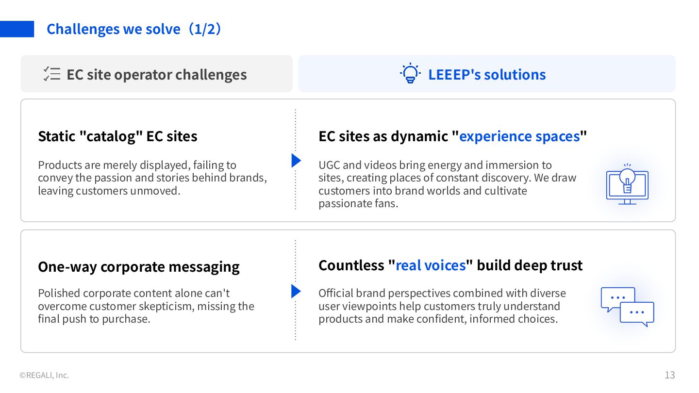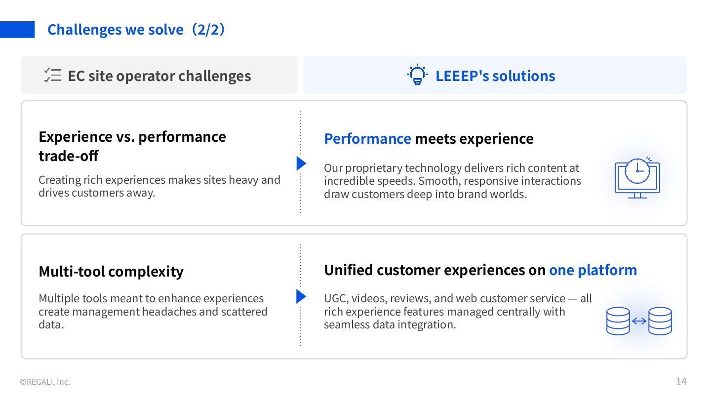 solve(1/2) Static "catalog" EC sites Products are merely displayed, failing to convey the passion and stories behind brands, leaving customers unmoved. 13 One-way corporate messaging Polished corporate content alone can't overcome customer skepticism, missing the final push to purchase. EC sites as dynamic "experience spaces" UGC and videos bring energy and immersion to sites, creating places of constant discovery. We draw customers into brand worlds and cultivate passionate fans. Countless "real voices" build deep trust Official brand perspectives combined with diverse user viewpoints help customers truly understand products and make confident, informed choices.