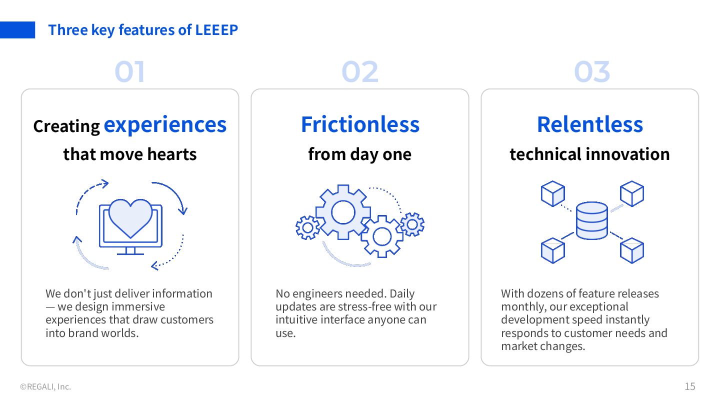 solve(2/2) Experience vs. performance trade-off Creating rich experiences makes sites heavy and drives customers away. 14 Multi-tool complexity Multiple tools meant to enhance experiences create management headaches and scattered data. Performance meets experience Our proprietary technology delivers rich content at incredible speeds. Smooth, responsive interactions draw customers deep into brand worlds. Unified customer experiences on one platform UGC, videos, reviews, and web customer service — all rich experience features managed centrally with seamless data integration.