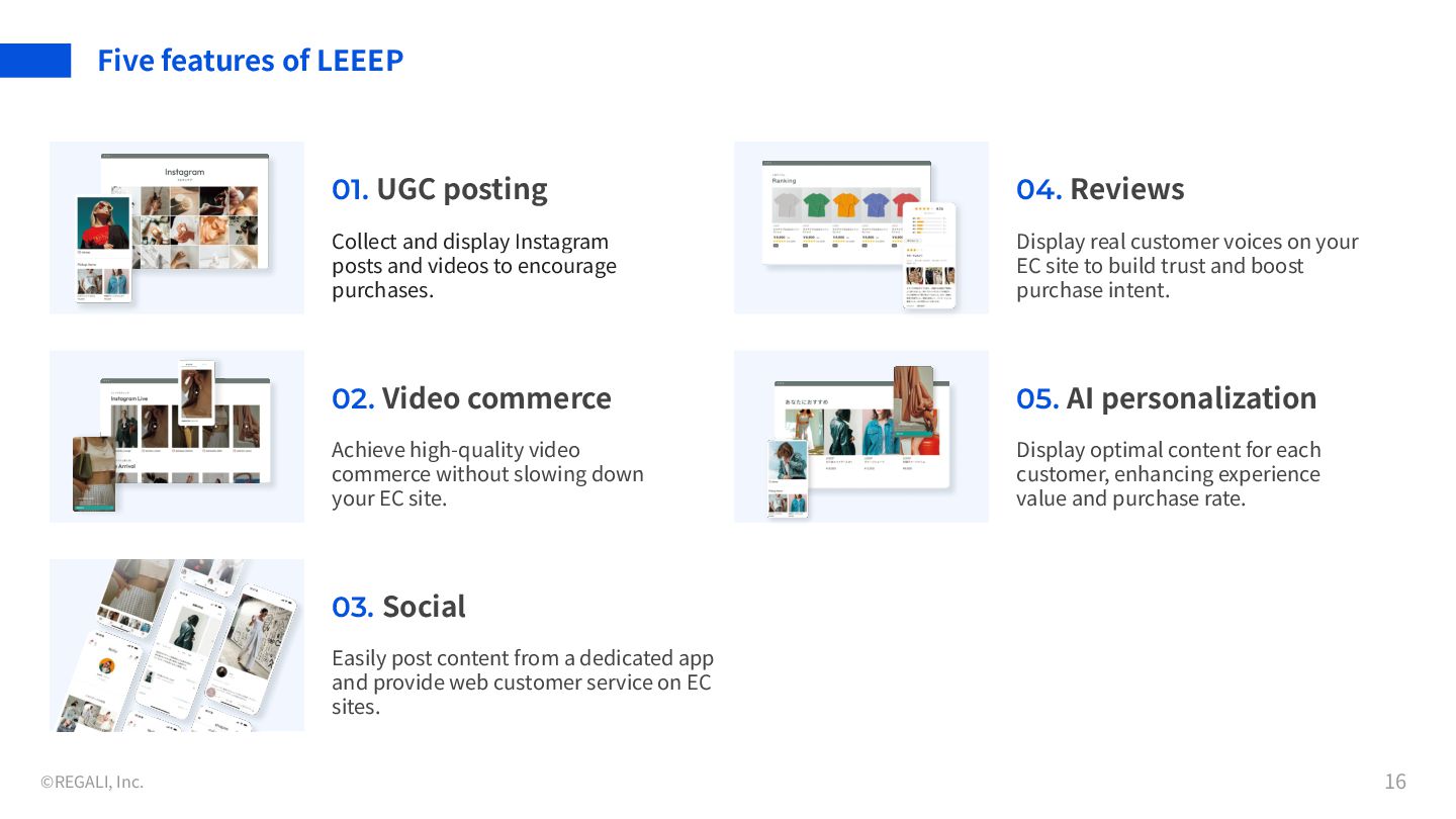 Instagram posts and videos to encourage purchases. 01. UGC posting Achieve high-quality video commerce without slowing down your EC site. 02. Video commerce Easily post content from a dedicated app and provide web customer service on EC sites. 03. Social Display real customer voices on your EC site to build trust and boost purchase intent. 04. Reviews Display optimal content for each customer, enhancing experience value and purchase rate. 05. AI personalization