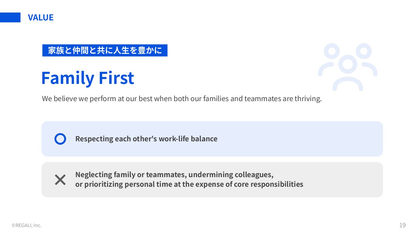 when both our families and teammates are thriving. Respecting each other's work-life balance Family First 家族と仲間と共に⼈⽣を豊かに Neglecting family or teammates, undermining colleagues, or prioritizing personal time at the expense of core responsibilities 19