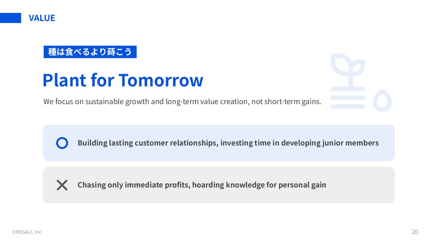 value creation, not short-term gains. Building lasting customer relationships, investing time in developing junior members Plant for Tomorrow 種は⾷べるより蒔こう Chasing only immediate profits, hoarding knowledge for personal gain 20
